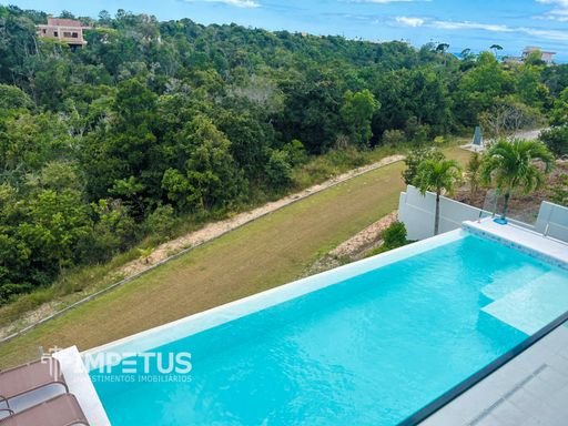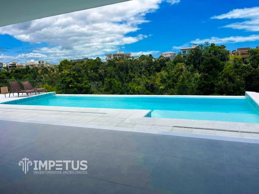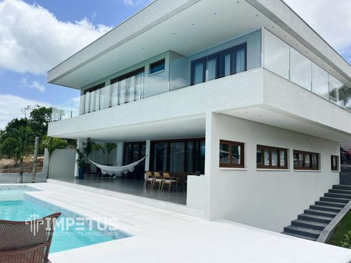 São 450m² de área construída em um terreno de 765m², com 4 suítes, sala ampla e cozinha integrada à área externa — ambientes que se conectam perfeitamente a uma piscina de borda infinita com vista permanente para uma Área de Preservação Ambiental e vista lateral para o mar.