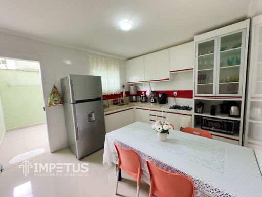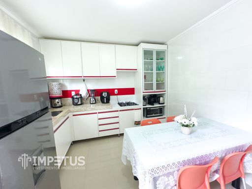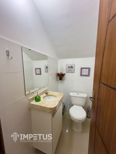 No pavimento inferior, o imóvel conta com uma sala ideal para criar um ambiente acolhedor de estar e convivência. A cozinha é funcional, com bancadas em granito que valorizam o acabamento e a cozinha planejada. Ainda nesse pavimento, há um lavabo, além de uma área de serviço bem posicionada.
